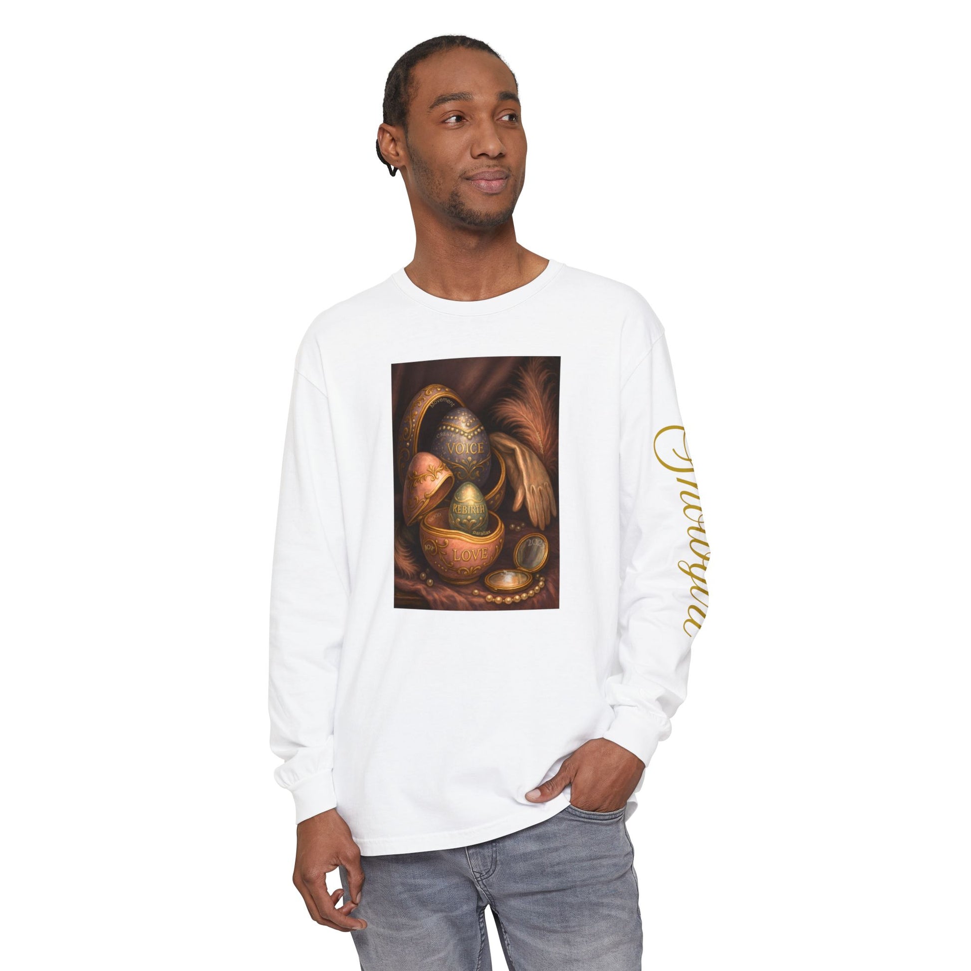 This Bejeweled Easter Egg Long Sleeve Tee in Showgirl Style Comfort Colors Ring Spun Cotton gives off a fun and festive vibe, perfect for Easter celebrations. It is relevant to adults looking for a comfortable and stylish shirt for the holiday.