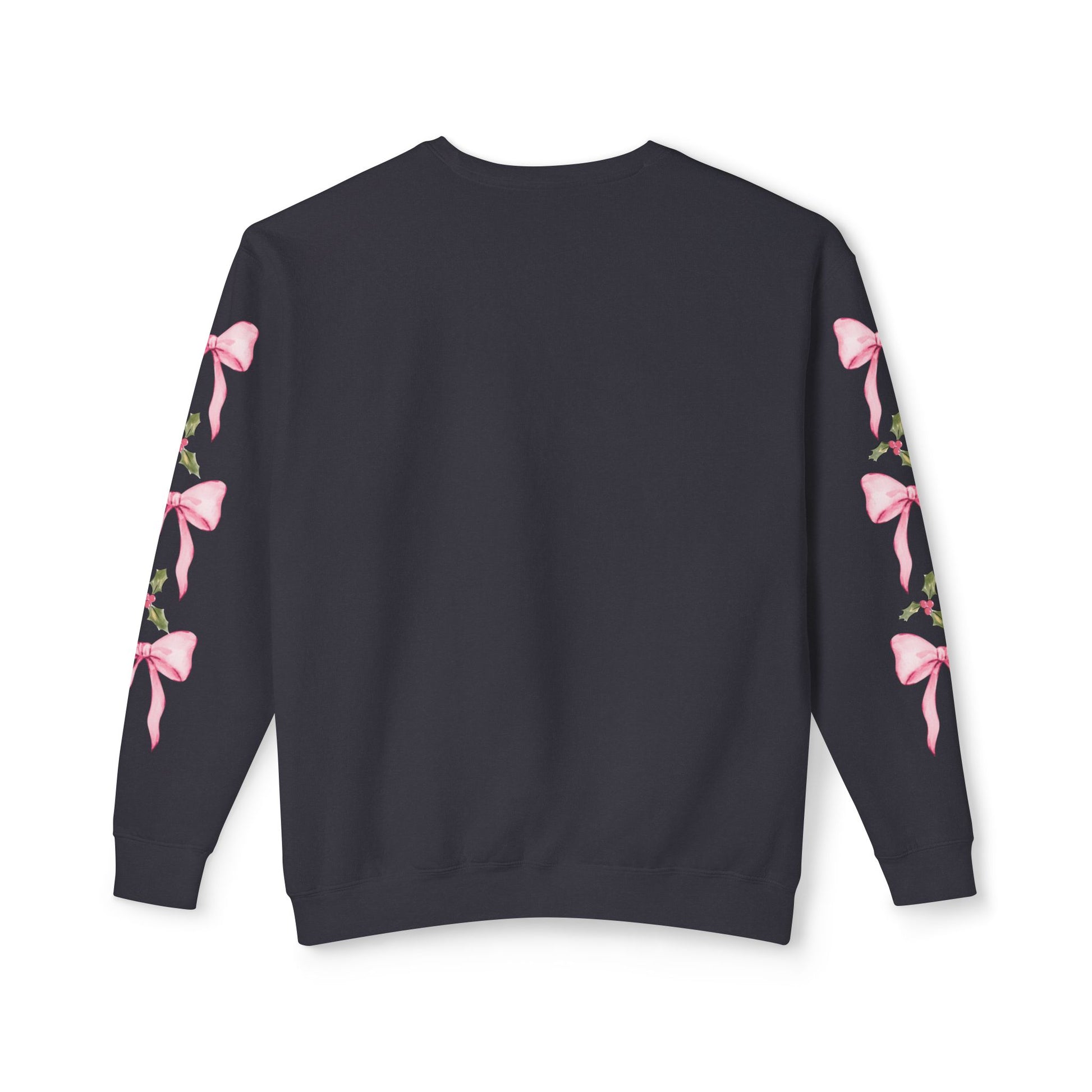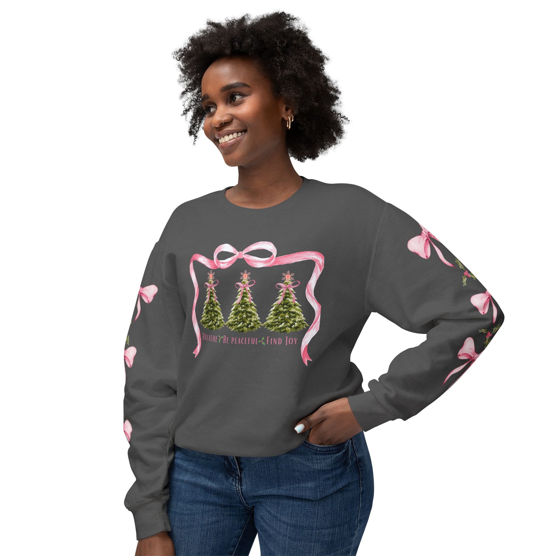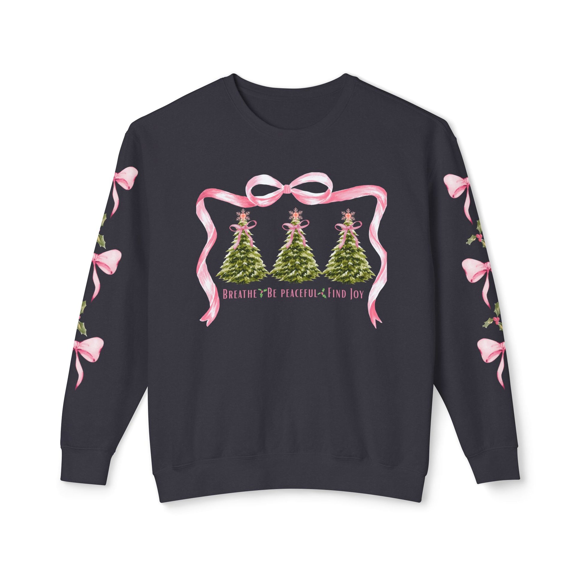 Soft, light, and quietly festive — this crewneck brings a delicate holiday charm without shouting. Three watercolor-style evergreen trees sit framed beneath a flowing pink ribbon, while matching pink bows trail down the sleeves. The relaxed, lightweight cotton drapes easily over layers, so it slips on for a chilly morning walk, a cozy cocoa night, or a low-key family gathering. It feels like wrapping yourself in a gentle holiday memory: subtle, feminine, and quietly joyful.