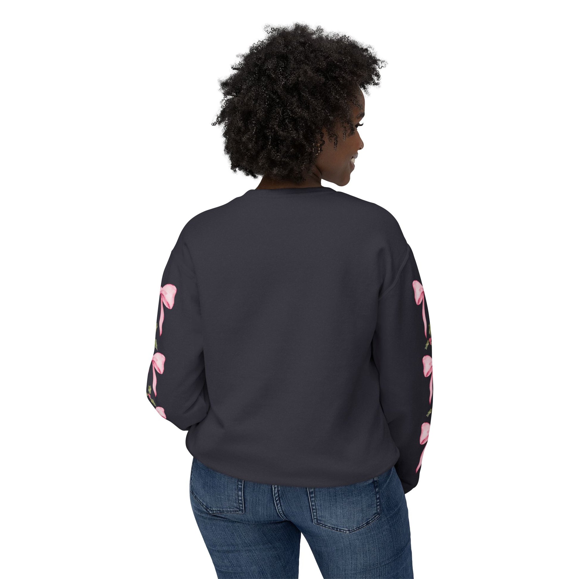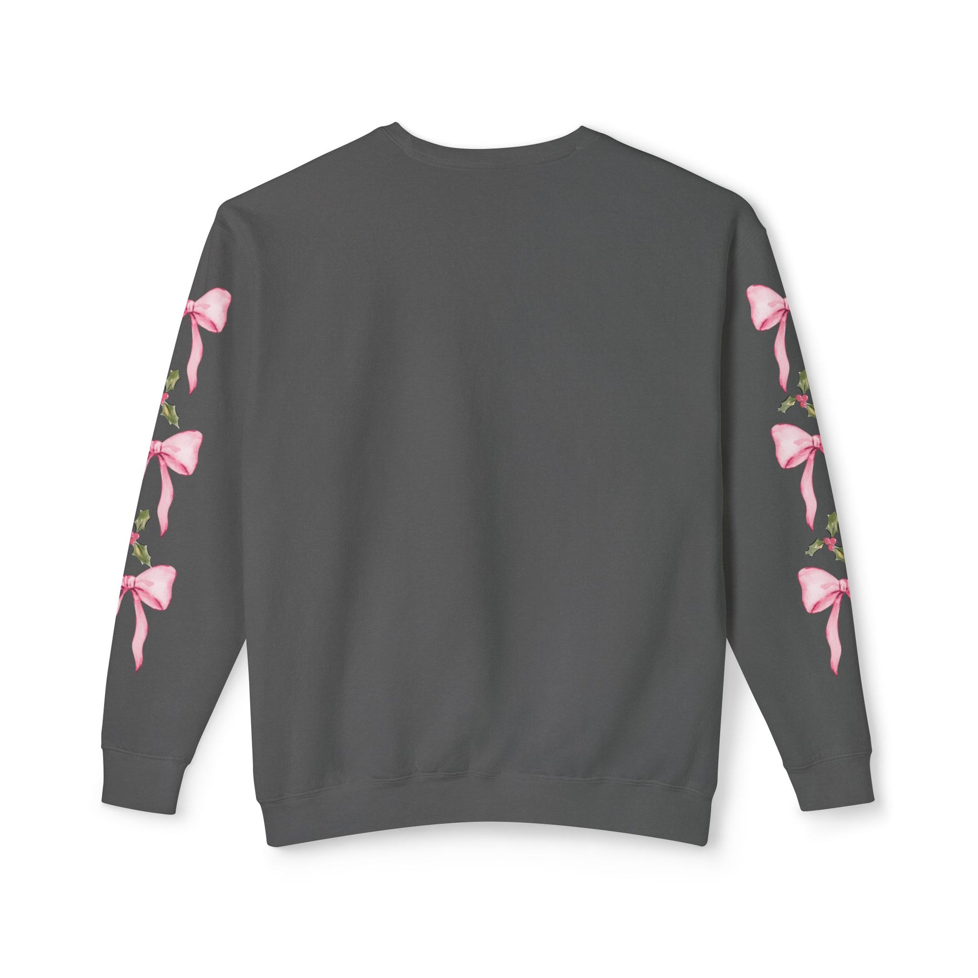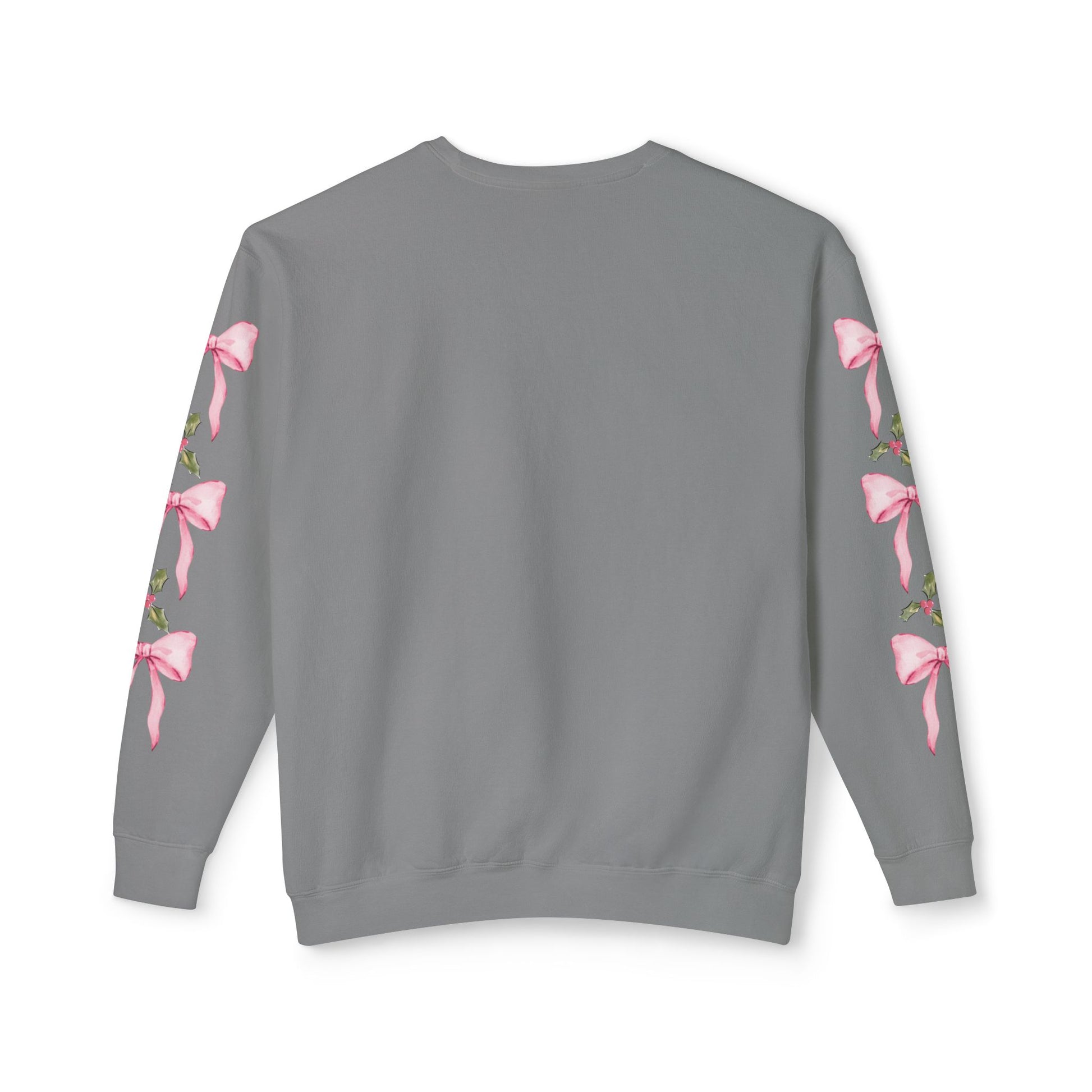 Soft, light, and quietly festive — this crewneck brings a delicate holiday charm without shouting. Three watercolor-style evergreen trees sit framed beneath a flowing pink ribbon, while matching pink bows trail down the sleeves. The relaxed, lightweight cotton drapes easily over layers, so it slips on for a chilly morning walk, a cozy cocoa night, or a low-key family gathering. It feels like wrapping yourself in a gentle holiday memory: subtle, feminine, and quietly joyful.