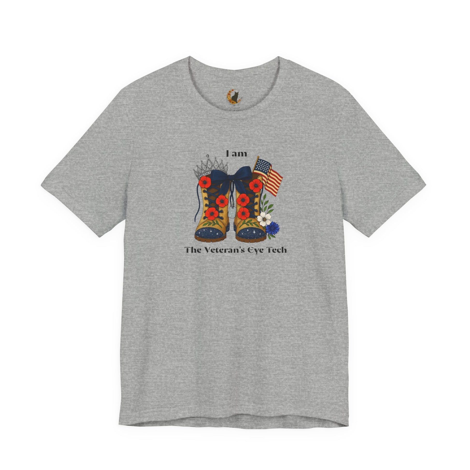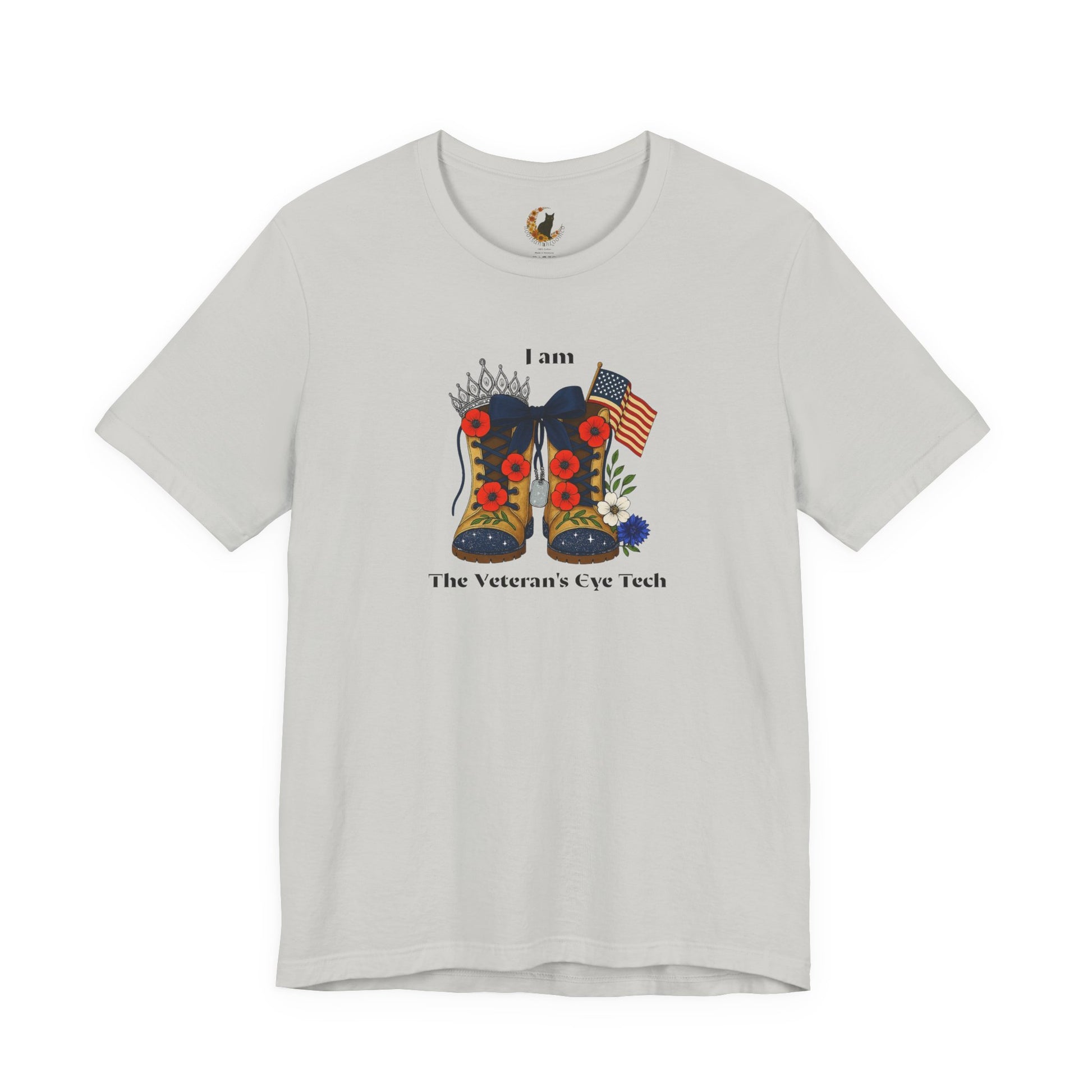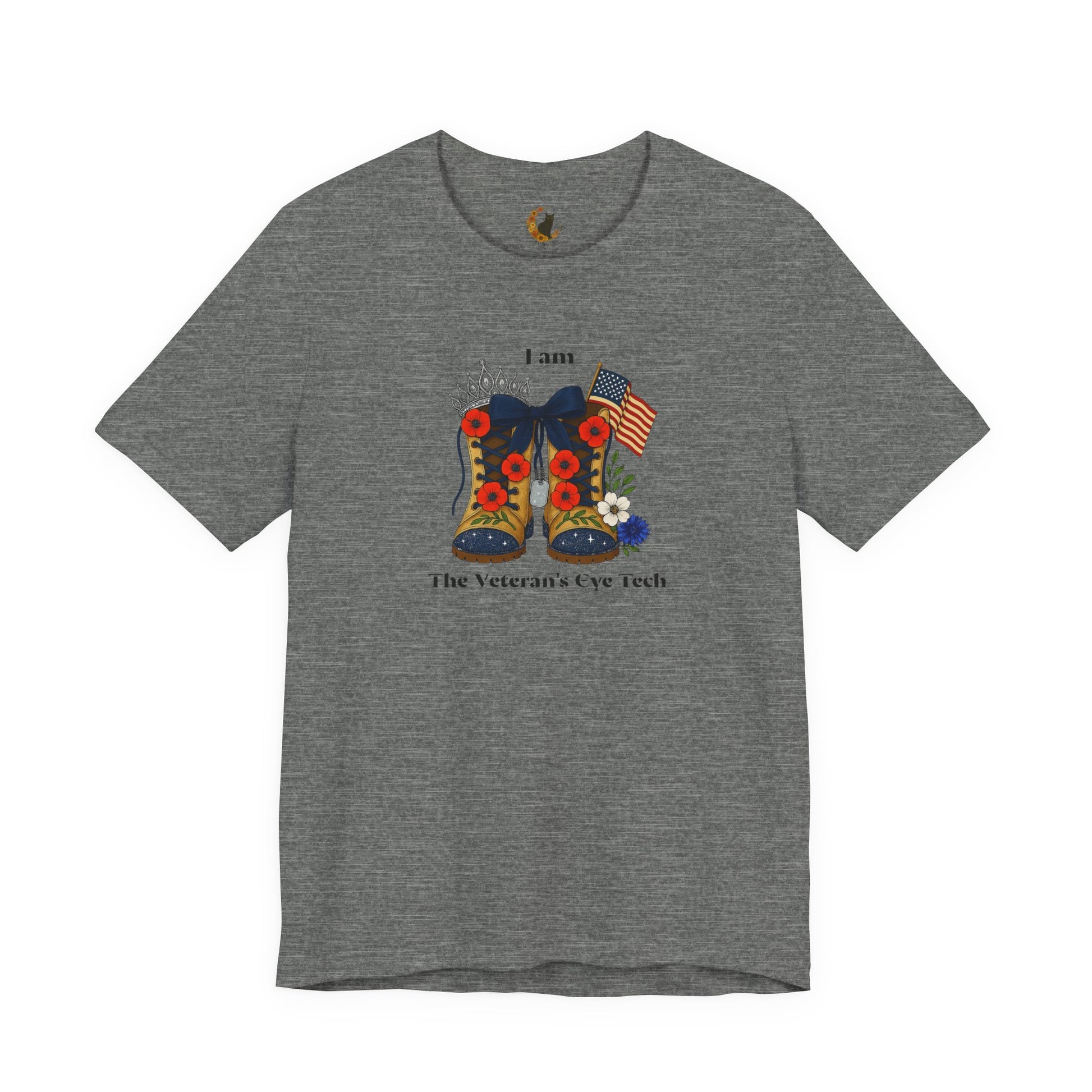 This Veteran's Eye Tech Tee is made from buttery soft Bella and Canvas cotton, designed as a unisex shirt to show military pride. It is a patriotic apparel perfect for veterans' health techs, offering a comfortable and stylish way to honor their service.