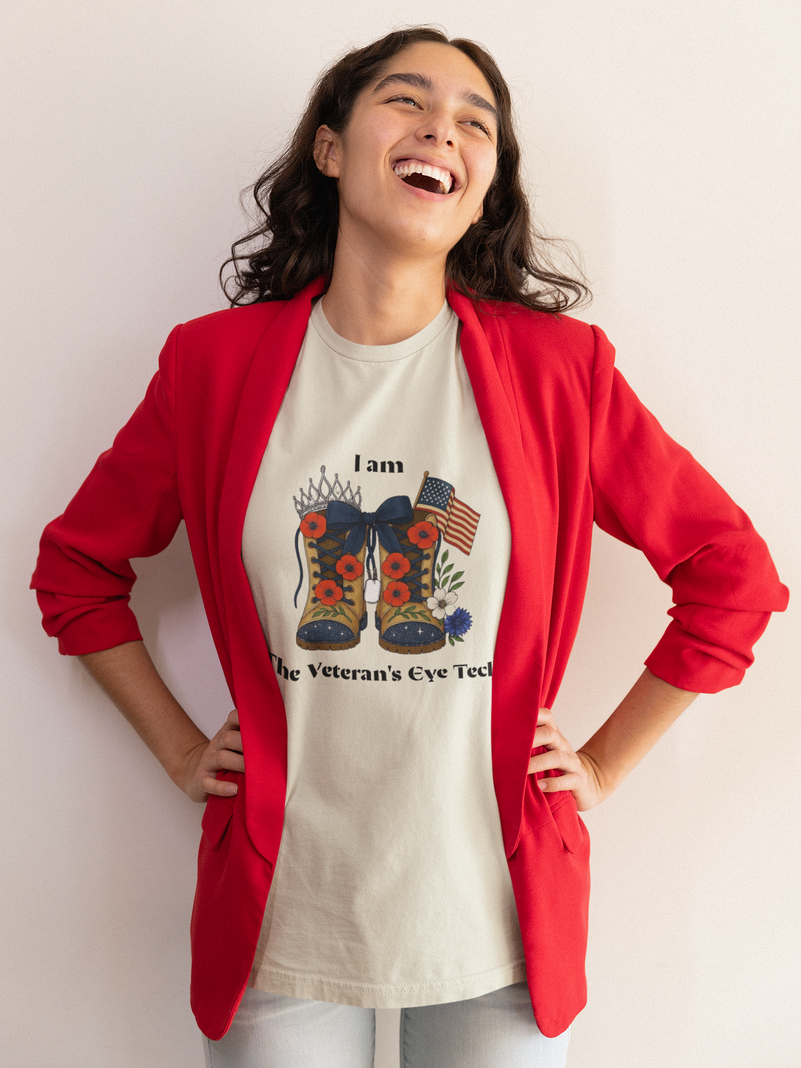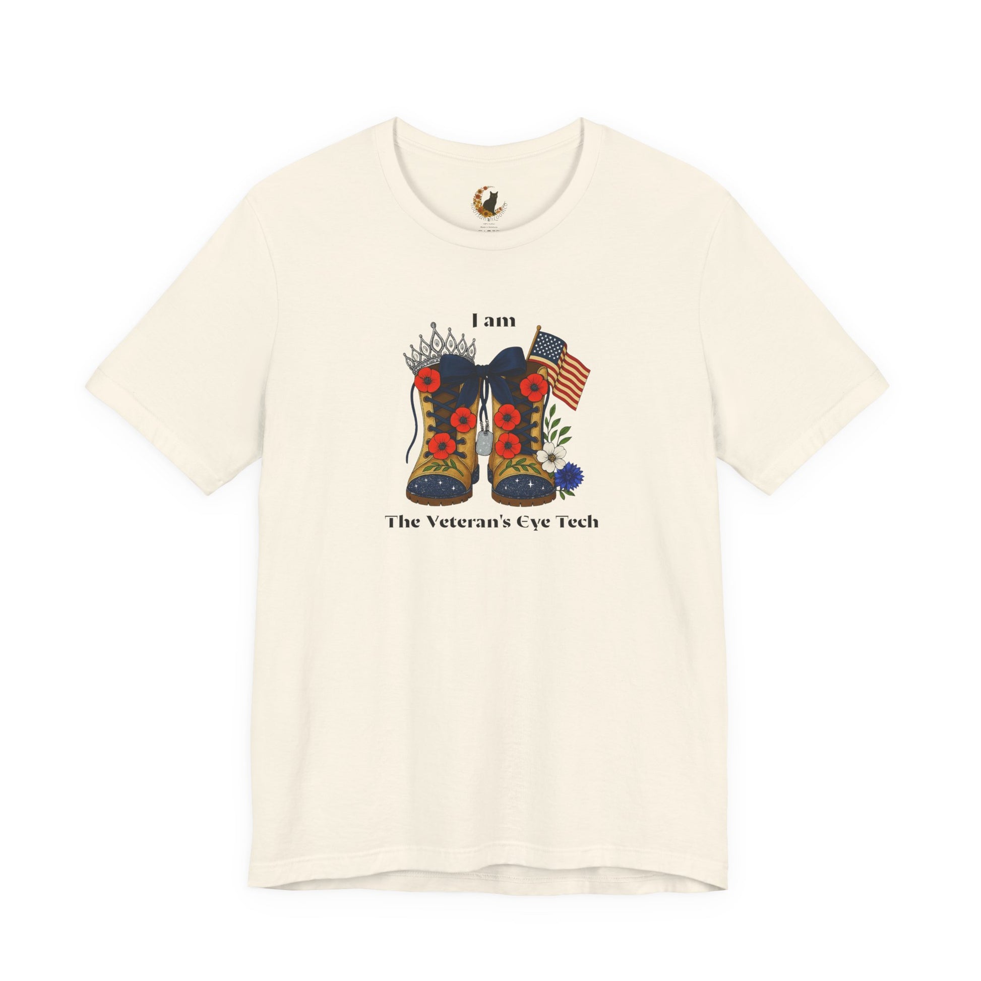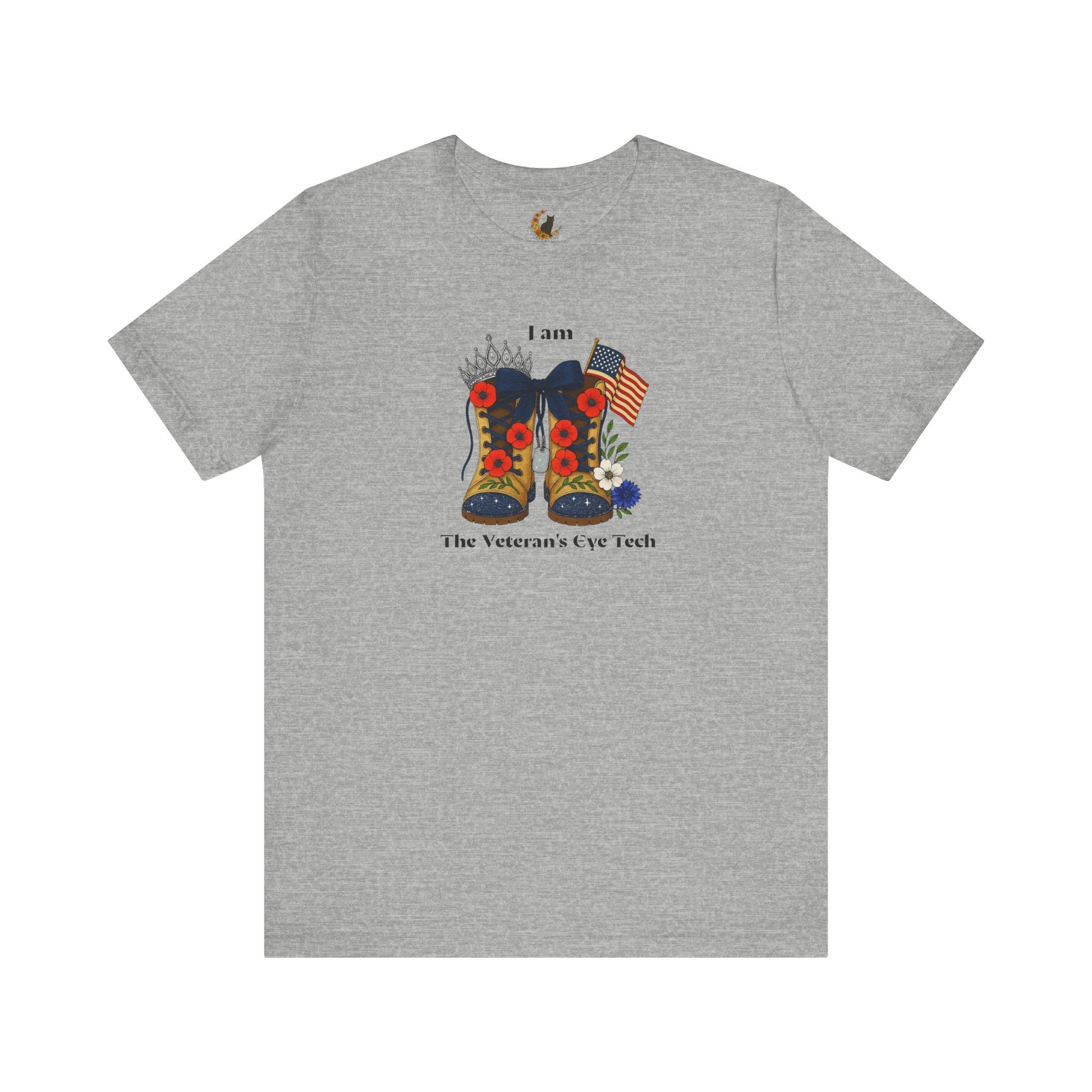 This Veteran's Eye Tech Tee is made from buttery soft Bella and Canvas cotton, designed as a unisex shirt to show military pride. It is a patriotic apparel perfect for veterans' health techs, offering a comfortable and stylish way to honor their service.